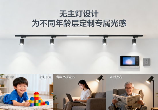 在無主燈設計的浪潮中,我們常被"極簡"和"高級感"所吸引,卻忽略了照明設計最根本的目的——服務人的需求。不同年齡層對光線的生理需求差異顯著,從兒童的柔和暖光到老年人的高亮度照明,無主燈設計若要真正發揮其優勢,必須建立在對使用者需求的深刻理解之上。