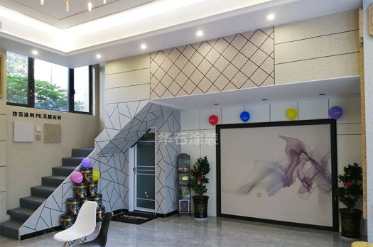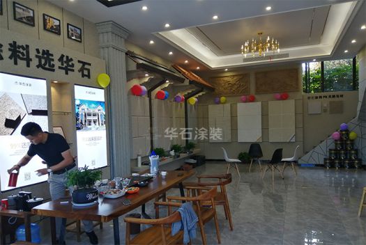 華石涂裝婺城旗艦店整店的裝修沿用了旗艦店面的設計風格,全店皆采用仿石涂裝,搭配別墅常用的裝飾構件,店內精美的藝術畫和別致的燈飾,更讓高端大氣的店面散發著強烈的藝術氣息。