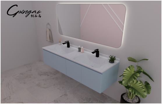 經(jīng)過多年探索,創(chuàng)品高自主研發(fā)出新一代人造石——綺美石,它具有無縫拼接、熱彎性強、顏色種類豐富、造型多樣多變、環(huán)保綠色等優(yōu)點。以綺美石為原材料打造的浴室柜,表面光滑,手感細膩,質感高級,極簡設計更襯托出浴室的高端、主人家的品味。