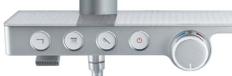恒潔雨沐花灑采用人性化的實用設計,置物面板上設計了功能按鈕,從左至右分別為下水龍頭、頂噴花灑、手持花灑、一鍵暫停按鈕,可以根據需要同時開啟1種到3種功能,且能直觀明了地清晰分辨哪種功能正在工作,誤判的尷尬從此不會再有。最右邊的恒溫旋鈕解決了沐浴時水溫冷熱不均的問題,旋鈕內部設置恒溫棒,能通過對冷、熱水的進水量控制來保證出水恒溫。一般情況下,旋鈕自動停留在中間38℃人體沐浴最舒適的溫度之上,同時也可根據個人需求進行調節:往右旋轉輕松調低溫度,按住旋鈕下方的童鎖按鈕同時往左旋轉能調高溫度,童鎖按鈕則考慮到防止小孩誤操作導致燙傷。