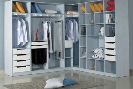 由不同規格尺寸的雙飾面板材組合而成。主要由面板、背板、側板、腳線、門板構成。其中柜體內包含各種特色小部件有:拉藍、L架、褲架、推拉鏡、格子架、層板。