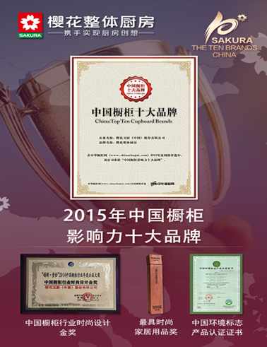 2015年9月1日由中國(guó)櫥柜網(wǎng)主辦,新浪家居、鳳凰網(wǎng)、搜狐家居、央視網(wǎng)等數(shù)十家國(guó)內(nèi)綜合媒體鼎力支持的2015“中國(guó)櫥柜十大品牌”評(píng)選活動(dòng)落下帷幕,在此次投票活動(dòng)中,櫻花整體廚房榮獲 “中國(guó)櫥柜十大品牌”稱(chēng)號(hào)。這是櫻花整體廚房連續(xù)兩年獲得“十大品牌”的稱(chēng)號(hào),這是廣大消費(fèi)者的評(píng)價(jià)和信任。
