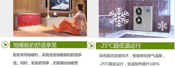 南極星極光?變頻速熱空氣能采用直流變頻技術,智能降低排氣溫度,-25℃超低溫環境下穩定運行,低溫制熱量提升100%,可以滿足我國90%以上寒冷地區的熱水、采暖,很好的解決了空氣能熱泵在低溫環境下“低溫低能效”的不足。與“溫暖+Ⅲ”專用地暖機黃金搭檔,實現全屋地暖般的舒適享受,而且無需鋪設地暖管,安裝更簡單,省下大量的安裝費用。