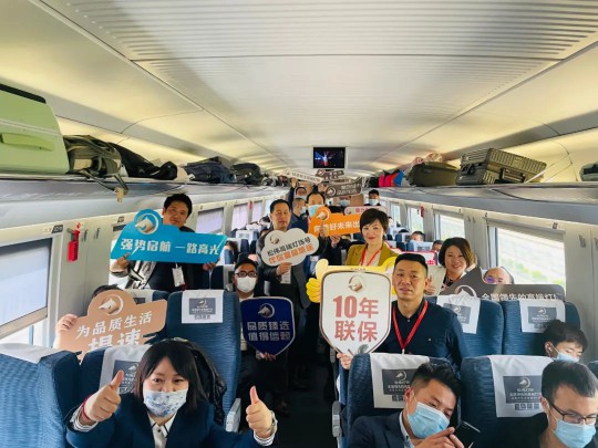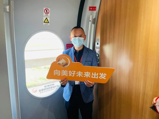 隨后松偉團(tuán)隊一行進(jìn)入高鐵站臺,為冠名列車揭幕,并進(jìn)入車廂內(nèi)參觀留影。