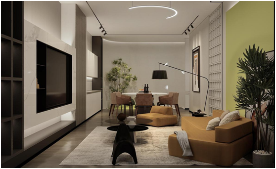 五光十色通過把握年輕消費者對現代化、簡約化的裝潢偏好以及對高質量、高質感生活的追求,結合當下大受歡迎的無主燈設計和亮眼的撞色,在新終端中將精心構思的細節點綴在主臥、門廊、客廳等每個角落,強調線條美、比例美、結構美在設計中的出彩應用,將前衛的眼光和大膽的設計充分發揮,實現藝術氣息、現代科技感和日常宜居感的緊密結合,給年輕顧客打造一個理想的“家”。