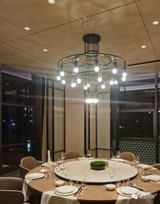 萬怡酒店豪華包間,全景落地窗,自然采光良好,視野極佳。JINHAN金漢燈飾沿襲萬怡酒店室內設計一貫風格,設計多層線型簡約吊燈,既彌補空間單調感,又作為包間主照明,營造愉悅的用餐氛圍。