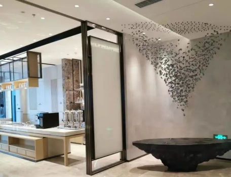 另一間多功能小宴會廳,JINHAN金漢燈飾利用藝術造景的手法定制一組長10.5米,高3米的水晶藝術燈飾——秋日楓景——將琉璃色手工藝術裝飾楓葉玻璃作為配飾,每片玻璃形似楓葉,紋理清晰,晶瑩剔透,無規則地交錯陳列,僅楓葉規格就達12種之多。