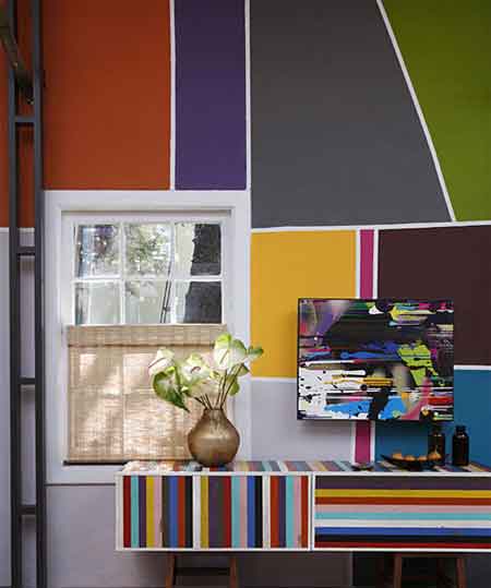 墻面色彩繽紛燦爛,冷暖兩種色調(diào)的對撞,相補(bǔ)相對的顏色搭配,呈現(xiàn)出多姿多彩的視覺墻面。通過色彩的變化,來改變原本單調(diào)的白墻,同時巧花心思,色塊形狀也略做改變,呈現(xiàn)出多變個性的家居空間。后期軟裝配飾也做了不錯的點(diǎn)綴跟配合,色彩條紋的小邊桌也格外亮眼。