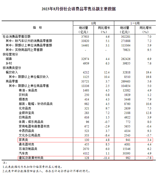建筑及裝潢材料類方面,8月份零售總額為128億元,環比(7月122億元)增長4.9%,同比下降11.4%;1-8月零售總額為982億元,同比下降7.8%。