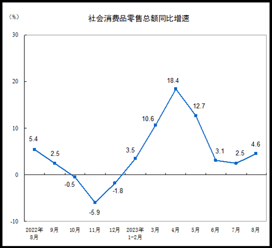 總的來看,8月份,社會消費品零售總額37933億元,同比增長4.6%。1-8月份,社會消費品零售總額302281億元,同比增長7.0%。
