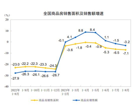 國家統計局資訊發言人付凌暉在國 新 辦資訊發布會上表示,從8月份情況看,房地產市場目前還處在調整階段,市場銷售和房地產投資仍在下降。前8個月,商品房銷售面積下降7.1%。商品房銷售額下降3.2%。從投資來看,前8個月,房地產開發投資同比下降8.8%,降幅略有擴大。但隨著房地產市場調整優化政策措施落地見效,經濟恢復向好,下階段,房地產投資、銷售、市場運行將逐步趨于改善。