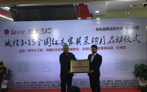 中華文化促進(jìn)會(huì)木作工作委員會(huì)主任趙夫瀛主任在致辭中分享了木工委等機(jī)構(gòu)共同倡議發(fā)起本次誠信月系列活動(dòng)的初衷,對紅博館一直以來引領(lǐng)紅木行業(yè)誠信經(jīng)營,文化創(chuàng)新等方面做出的努力與貢獻(xiàn)作出肯定。隨后,他為紅博館頒發(fā)“誠信315全國紅木家具采購月聯(lián)合主辦單位”牌匾。