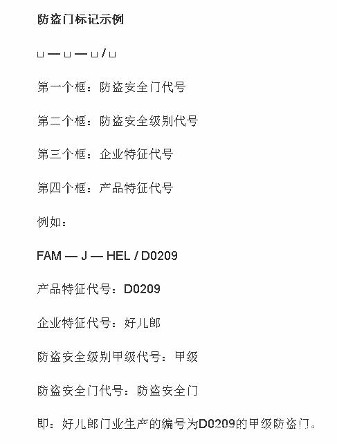 接下來(lái)小編要教大家如何挑選一款適合自己的,先來(lái)了解一下門上的標(biāo)記是什么意思。由三個(gè)部分組成:標(biāo)記符號(hào)為拼音字母,從左到右分別為防盜安全門代號(hào)(FAM)、防盜安全級(jí)別和企業(yè)自定義特征(包括企業(yè)代號(hào)和產(chǎn)品代號(hào)兩部分)。其中,防盜安全級(jí)別標(biāo)記永久固定在內(nèi)側(cè)鉸鏈邊上角,距地面高度為1600mm±100mm的位置上 。