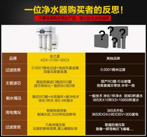 而安之星50C3智能凈水器搭載的世界頂級美國陶氏RO膜,過濾精度高達0.0001微米,更是讓追求高品質的消費者一看就愛,該產品除過濾精度高之外,陶氏RO膜的先進全自動卷膜及切邊技術也使其相比同等尺寸的膜,有效膜面積增大10-15%,經過這種濾芯過濾的凈水,水質更純,絕對讓您喝的放心!在智能方面,安之星50C3智能凈水器也進行了很大的革新,不僅把廢水比控制在1:0.4,首創行業最低廢水比,而且還能半個小時自動斷電保護,做到了節電80%,可說是創造了行業“節水節能”顛覆。