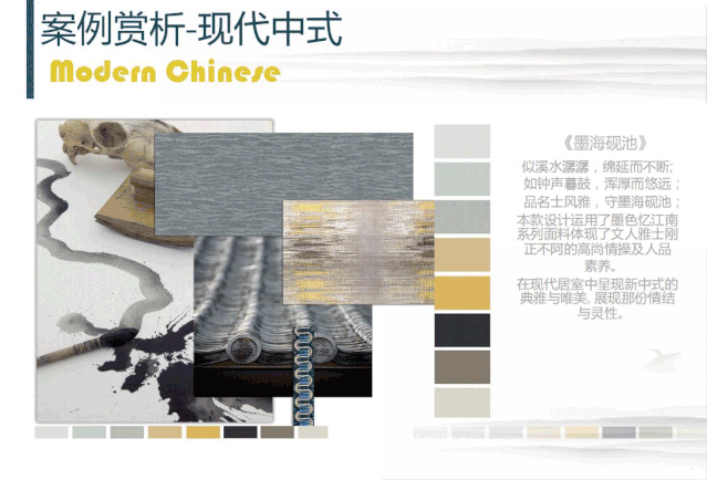 本款設計運用了墨色憶江南系列面料體現了文人雅士剛正不阿的高尚情操及人品素養。運用在現代居室中呈現新中式的典雅與唯美動同時更能展現出那份情結與靈性。