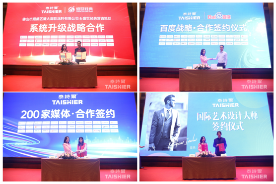 會議在來賓的熱烈掌聲下進入第二個重要的環節——現場簽約。隨著眾多自媒體的崛起,信息的傳播渠道多樣化,在這種趨勢下,信息的權威性就變得更為重要。泰詩爾順勢而為,強強聯合,整合品牌營銷資源,舉行“千萬巨資,品牌推廣”的簽約儀式。本次會議,泰詩爾與知名品牌營銷策劃機構盛世經典、500家權威媒體、國外設計大師、百度進行簽約儀式,并在媒體朋友們的相機鏡頭下合影留念。