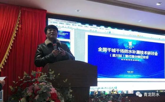 研討會首先從青龍遂川代理商羅總的開幕致辭開始。羅總真情分享了其加盟青龍公司的經歷和個人感受,并以業務工程為案例,將青龍特色防水材料產品與其他品牌產品相比較,介紹其對青龍產品的認識和防水補漏效果。羅總表示,經歷這么多年的防水從業經歷,非常認可青龍防水材料產品,相信會越做越順暢。