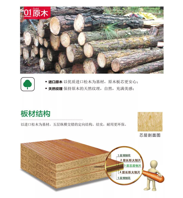 5S凈醛板也稱“歐松板”,以新西蘭進口松木為原料,利用專業(yè)設(shè)備加工成木刨片,再經(jīng)脫油、干燥、施膠、定向鋪裝、熱壓成型等工藝制成的一種定向結(jié)構(gòu)板材,表層刨片呈縱向排列,芯層刨片呈橫向排列。