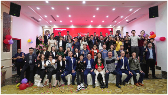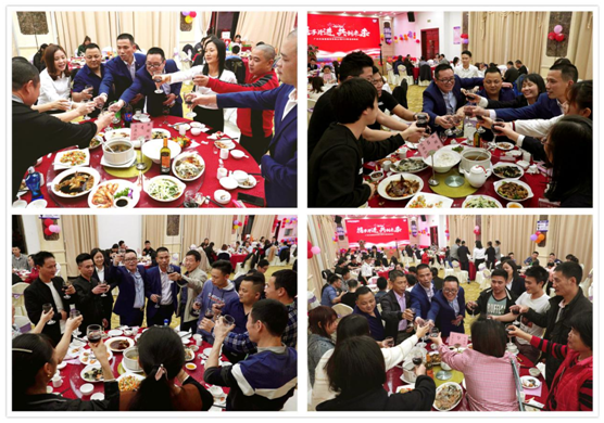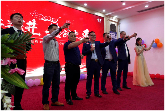在一片祝福聲、熱烈掌聲、禮炮聲中,晚宴正式拉開帷幕!美佰利總經理潘宇青先生帶領各高層領導一起上臺祝酒:感謝美佰利家人們2019年的奮斗,感恩家人們的堅持與付出。