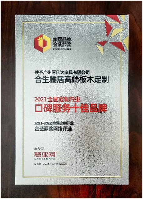 合生雅居憑借優質的口碑和過硬的品牌實力,榮獲“金菠蘿品牌盛典榮譽榜單”全屋定制口碑服務十佳品牌大獎,獲此殊榮也充分的體現了廣大消費者對合生雅居的高度認可與支持,為合生雅居輝煌征程再添榮耀與激勵!