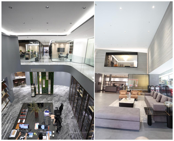 其中,營銷中心產品展廳采用了現代輕奢極簡風格設計,簡約不凡、舒適實用,集產品展示與多功能會客廳為一體,為到訪客戶展示品牌全新產品及舒適的場景化參觀體驗。