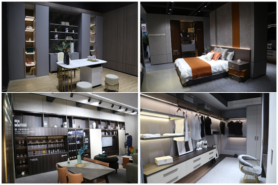 在展館內(nèi)部,展示了簡(jiǎn)鉆旗下的“輕奢至臻”系列,采用進(jìn)口板式與當(dāng)今潮流色互相搭配,釋放詩(shī)意與浪漫的空間。柜體運(yùn)用結(jié)構(gòu)感強(qiáng)烈的墻面設(shè)計(jì),凸顯極簡(jiǎn)美感,探尋無(wú)拘束生活潛能。