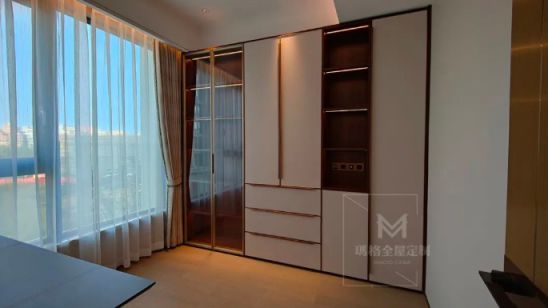 咖色搭配白色的一字柜體巧妙地利用空間,轉角以抽柜和開放格組合設計,提供多樣收納空間,背景護墻以金線點綴,低調而雅致。