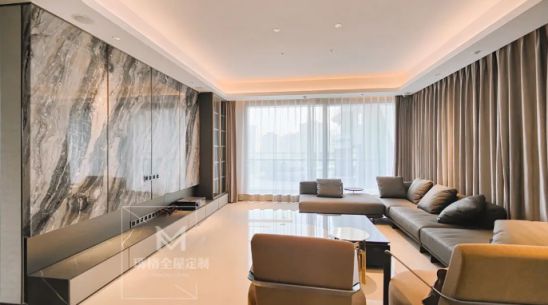 客廳雙面設置寬境落地窗,將窗外風景框成一幅隨四季而動的畫卷,電視背景墻引入自然巖板細膩紋理與光影相映成趣續寫時光的詩意。
