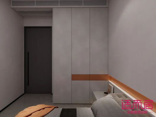男孩房,也是用新品凱曼石紋,有一種侘寂風的感覺,橙色元素點綴,灰色調,簡約素雅。床頭與柜體一起設計,更加整體。