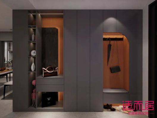 入戶鞋柜,采用深色為基調,愛馬仕作裝飾點綴,整個鞋柜設計非常有設計感,讓人眼前一亮的感覺。換鞋凳位置,還巧妙運用了圓弧門板的元素,將柜子設計的更加柔美~