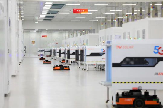 同時通威太陽能金堂項目積極與中國電信、華為強強聯合,全面采用5G+智能制造方案打造廠區,打造全球首個光伏5G應用基地,通過車間無人智能制造,園區數字化管理,室外無人駕駛倉儲物流等核心技術,率先實現工業數字化,生產智能化,管理智慧化。作為全球光伏行業智能制造引領者,早在2017年9月,通威太陽能就建成投產了世界首條工業4.0高效電池片生產線,機械臂、智能小車與信息化系統取代了以往傳統的人工操作方式,無人智能制造產線取代了傳統的人工產線,實現了數字化車間、智能化工廠。