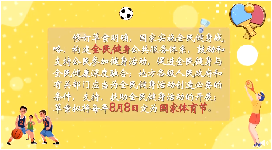 10月19日,《中華人民共和國體育法(修訂草案)》提請十三屆全國人大常委會第三十一次會議審議。修訂草案明確,國家實施全民健身戰略,構建全民健身公共服務體系;學校必須開設體育課,保證體育課時不被占用;擬定每年8月8日為國家體育節。