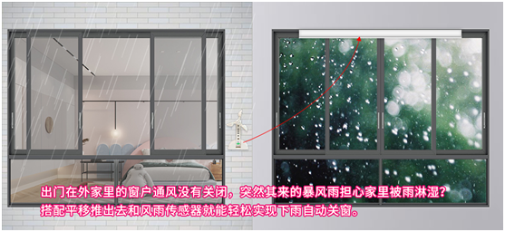 為了保證家中空氣流通,大家經(jīng)常出門去上班了,也不會關閉家里的窗戶,但是突如其來的暴風雨會把家中的電器、沙發(fā)給淋壞,在辦公室的你只能干著急?你可以安裝簡舒智能窗戶搭配一個風雨傳感器就能輕松實現(xiàn)下雨自動關窗,每次下雨時,都會觸發(fā)風雨傳感器,風雨傳感器會把下雨信號傳達給智能窗戶,智能窗戶會立即自動關閉窗戶,家中有個智慧管家,是不是瞬間就讓你的工作變得更加安心,生活更加舒心?