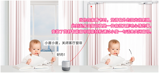 周未舒舒服服的躺在家里看書、玩游戲時,突然覺得窗外的陽光很刺眼,此刻起身關閉窗簾真的是一件麻煩又影響心情的事情,但是你安裝一個智能窗簾能就輕松的通過小度來關閉窗簾了,一句話搞定開關窗簾是一件很容易的事情“小度小度,關閉客廳窗簾”,窗簾立即乖乖的關閉,是不是瞬間讓我們的家居生活方便又貼心了很多呢?