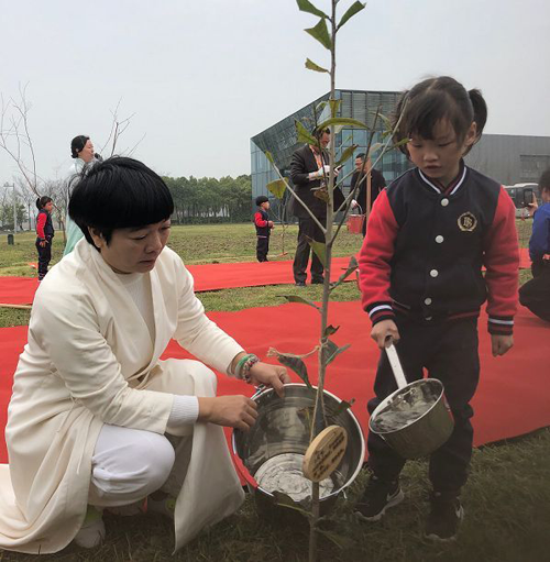 歐普照明創(chuàng)始人兼總裁馬秀慧(左)親手種下一棵樹苗。