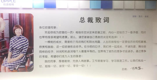 此時(shí),大部分的歐普員工都聚集于此,享受休閑的時(shí)光。員工宿舍區(qū)有一處歐普宣傳欄,里面有歐普照明總裁馬秀慧的致辭,也有歐普歷史介紹、公益活動(dòng)風(fēng)采、優(yōu)秀員工展示等。