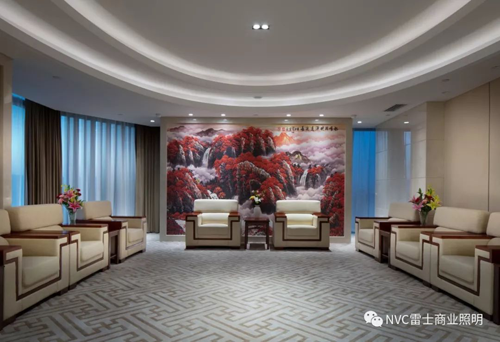 會客區的照明選用光效高,顯色性好的直管型熒光燈作為普通照明。用筒燈作為重點照明,打亮藝術作品,以燈帶勾勒建筑設計的形體,營造出親切放松的會客氛圍。