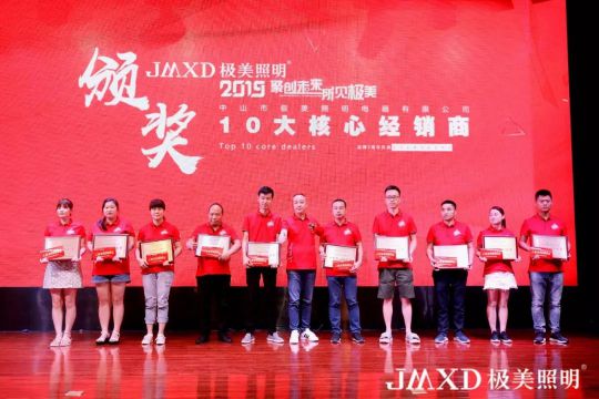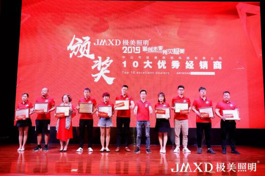 緊接著,舉行了隆重的頒獎環節。“十大潛力經銷商”、“十大鐵桿經銷商”、“十大優秀經銷商”、“十大核心經銷商”悉數登臺亮相。獲獎經銷商代表的訪談環節,他們都對極美照明充滿信心,對鄒總表示感恩。